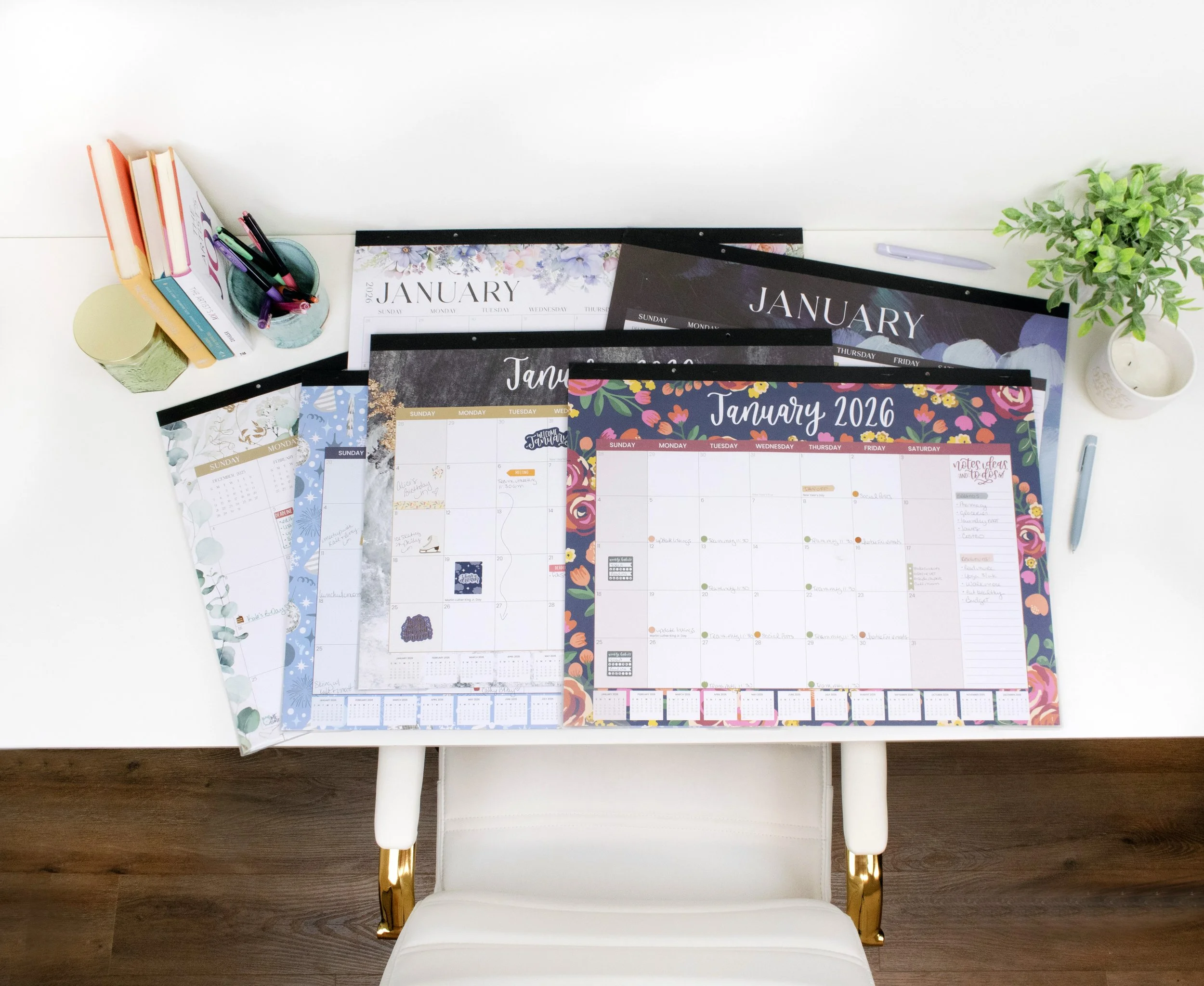The new collection includes Desk Calendars (16 x 21) in 6 design options (Holiday Icon, Vintage Floral, Greenery, Watercolor, Paint Strokes, and Seasonal Floral) dated January 2026 - December 2026. These popular and functional calendars work great on any desktop or even have holes to hang on the wall. They have ample writing space, pre-printed holidays, an extra vision board page plus clear plastic corners to hold pages in place and a free sticker sheet.