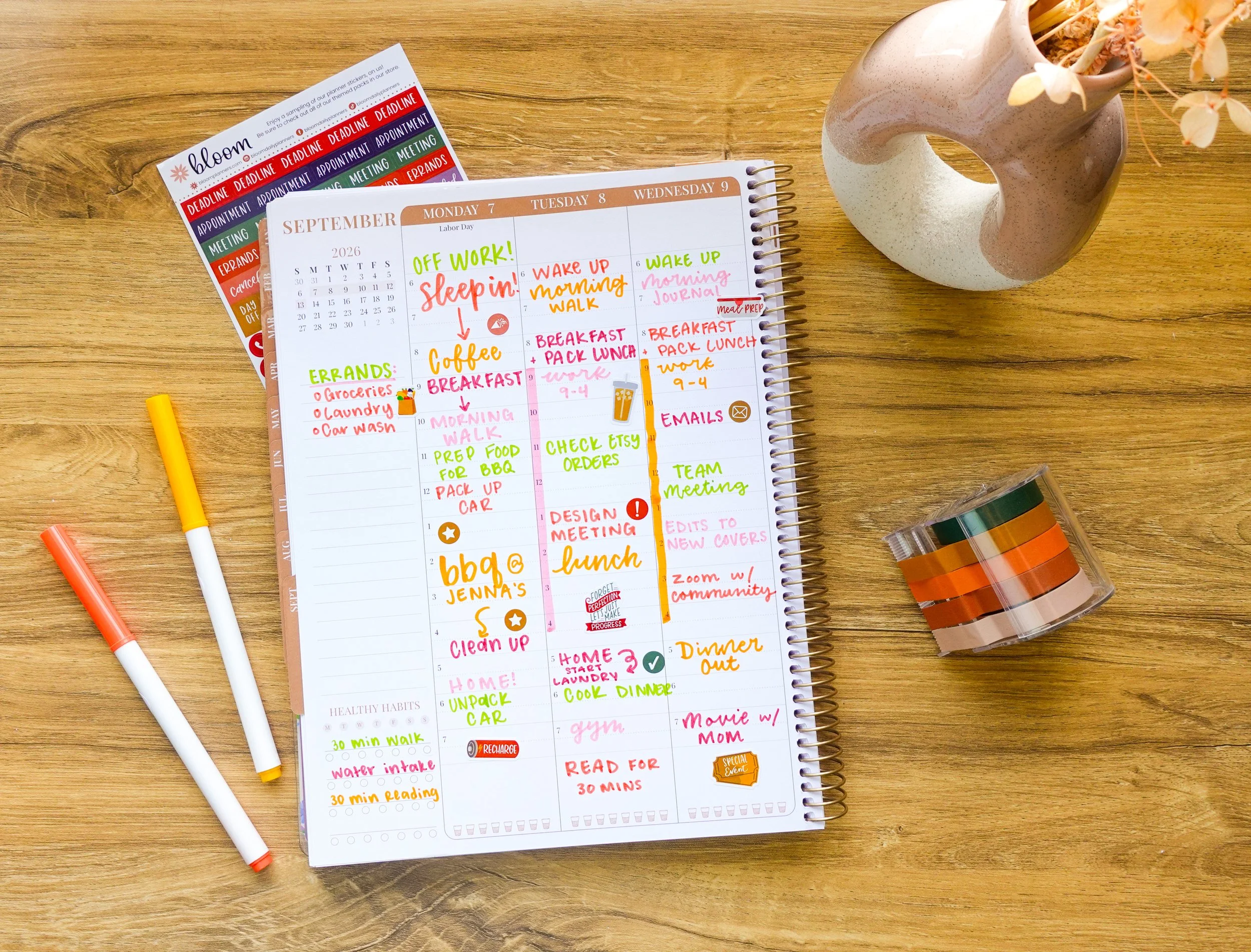 All of the planners are intentionally designed with monthly and weekly spreads plus goal setting and life coaching pages in the front as well as budgeting pages, habit tracking and a free sticker sheet and book mark. Some upgrades coming for 2026, the free book marks will now match the interior color palette of the planner, the included sticker sheets have been refreshed, three of the planner layouts will now have 110 GSM paper (Vision Planner, Vertical Hourly and Undated Daily To Do) plus the popular “Joy List” also includes a “Memories That Make Me Smile” section. The small 4 x 6 planners do not have folders, stickers or bookmarks.